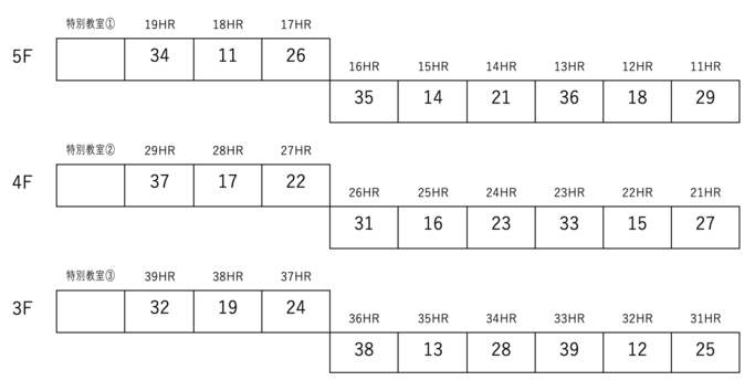 教室割り振り…展示教室の割り振りは以下のように定める。   ※枠内の数字が展示をするHR名