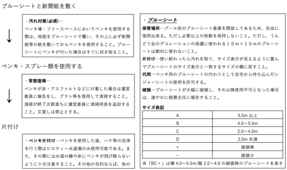 ・返却…当日二日目の片付け時に所定の位置に返却しなければいけない。(詳細は片付けマニュアル参照)